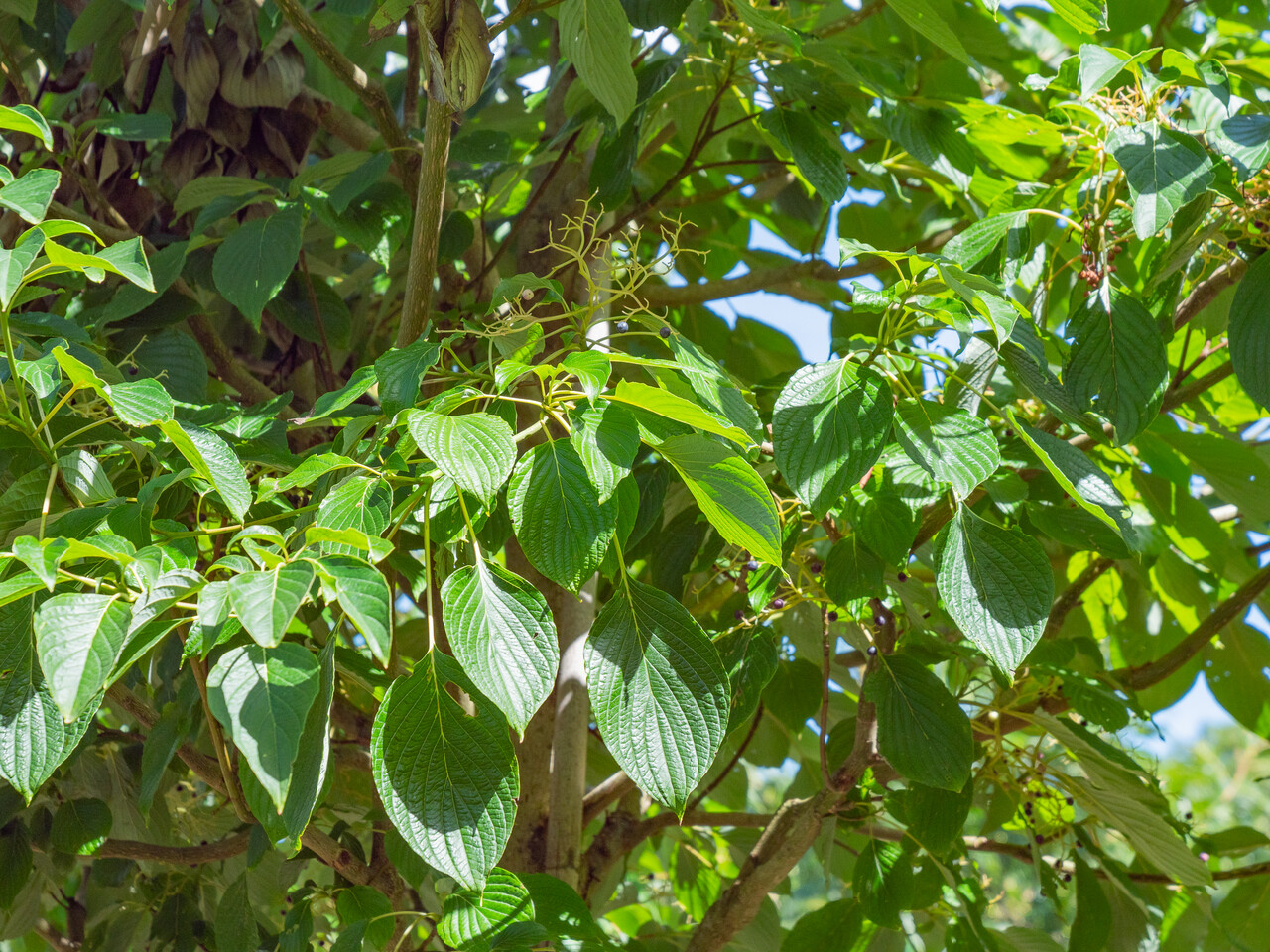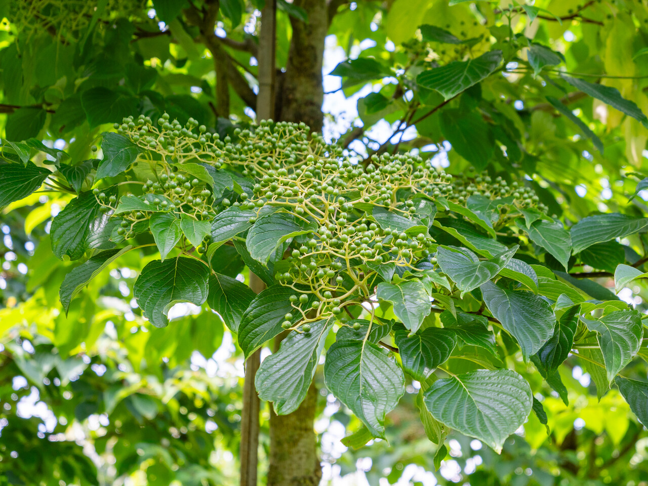 Kleine boom waarvan de horizontale, in etages groeiende, vertakking het belangrijkste kenmerk is. In het natuurlijke verspreidingsgebied soms uitgroeiend tot een 15 m hoge boom. De kroon kan net zo breed als hoog worden. Twijgen kleuren van roodbruin naar grijs. Het afwisselend geplaatste blad is onregelmatig in vorm en grootte en heeft een glanzend donkergroene kleur. De onderzijde is opvallend blauwgroen. In de herfst kleurt het purperrood. De schermvormige bloemtuilen kunnen een doorsnede van circa 15 cm krijgen. Ze staan op korte stelen en zijn gerangschikt over de horizontale vertakking. De vele, donkerblauwe bessen verschijnen in het najaar. In Nederland is de vruchtdracht erg wisselend en zeker niet gegarandeerd. Wortelt oppervlakkig met een fijn wortelgestel. Vanwege vroege sapstroom in het voorjaar moet snoei in zomer of najaar plaatsvinden.