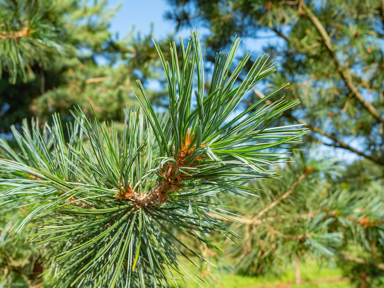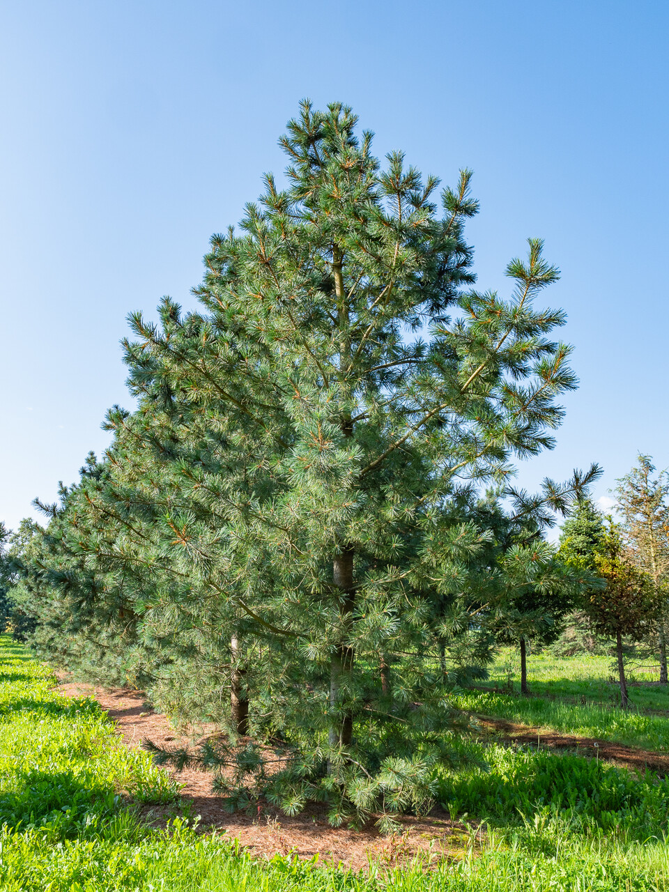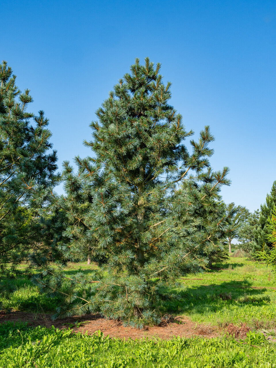 Pinus flexilis is een middelgrote boom (10 - 15 m) die van nature voorkomt in het westen en zuidwesten van Noord-Amerika. De jonge twijgen zijn erg buigzaam, waar de soortnaam ook naar verwijst. De naalden staan steeds in bundels van vijf naalden bijeen. De naalden zijn tot 10 cm lang en donkergroen tot groenig blauw. Ook bij 'Vanderwolf's Pyramid' zijn de naalden donker blauwgroen. Meer opvallend aan deze cultivar is de groeiwijze. Ondanks dat de takaanzet van de zijtakken vrij horizontaal is, groeit deze cultivar smal piramidaal omhoog. Uiteindelijk groeit 'Vanderwolf's Pyramid' vanuit een struikvorm uit tot een kleine boom van ongeveer 10 m hoogte. De boom is dicht vertakt, wat een compacte indruk geeft. Werd in 1972 geïntroduceerd door J. Vermeulen & Sons Nursery, Neshanic Station, New Jersey, USA en is genoemd naar de medewerker die de plant ontdekte, Rein Vanderwolf. Winterhardheidszone: 5a