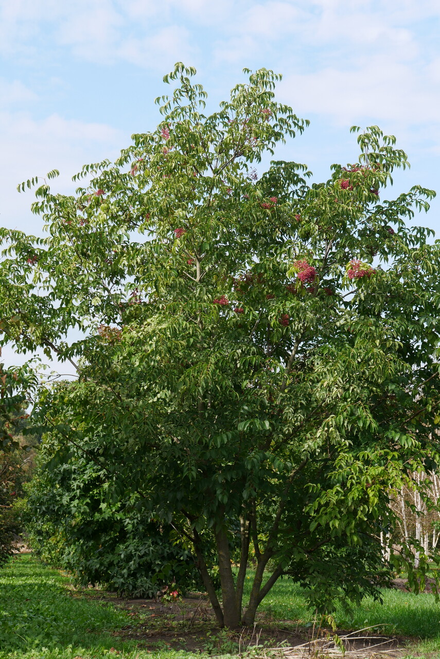 Snelgroeiende solitair met een halfopen, breed waaiervormige kroon op een korte stam. De gladde schors is donkergrijs en voorzien van lenticellen. Twijgen zijn olijfgroen, fluweelachtig grijs behaard en voorzien van kleine wittige lenticellen. In het tweede jaar worden ze grijsbruin. Het oneven geveerde blad bestaat uit 5 - 9 tegenoverstaande deelblaadjes en is 20 - 35 cm lang. Elk blaadje is eirond met een toegespitste top, 4 - 9 cm lang en kort gesteeld. De bovenzijde van het blad is donkergroen, de onderzijde lichtgroen. In breed piramidale pluimen van 10 - 15 cm staan geurende witte bloemen van elk 0,3 - 0,5 cm. Na de bloei volgen roodachtige vruchten. Lange tijd was deze boom bekend als Euodia, nog steeds een veel gebruikt synoniem.