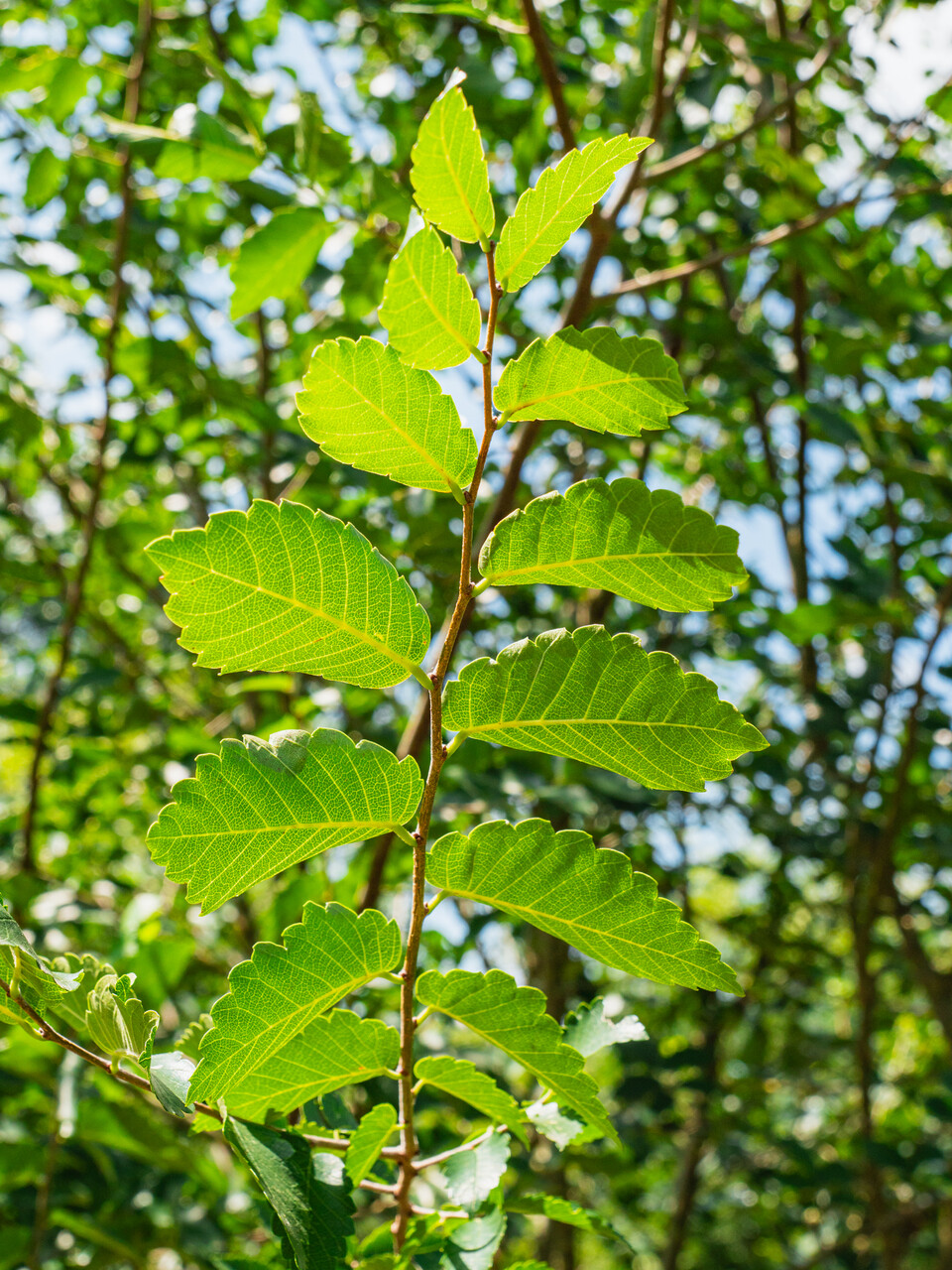 Grote boom met een duidelijk opgaande habitus en opgaande vertakking. De vertakking begint vaak al laag. Uiteindelijk wordt de kroon ovaal tot vaasvormig en 25 tot 30 m hoog. De jonge twijgen zijn bruin en onbehaard. De oude bast is grijsbruin, aanvankelijk glad maar later in kleine plaatjes loslatend waardoor de oranje onderbast zichtbaar wordt. Het iets scheve, eironde tot ovale blad is donkergroen en ruw behaard aan de bovenzijde. De onderzijde is lichter en zacht behaard. In de herfst kleurt het blad bruingeel. De onopvallende groene bloemen verschijnen tijdens of vlak na het uitlopen van het blad en worden gevolgd door kleine scheef ronde vruchten. De boom heeft oppervlakkig wat weg van Ulmus parvifolia maar verschilt hiervan door onder andere de eenslachtige bloemen en de ongevleugelde vruchten. Gemakkelijke parkboom met een fraaie kroonvorm.