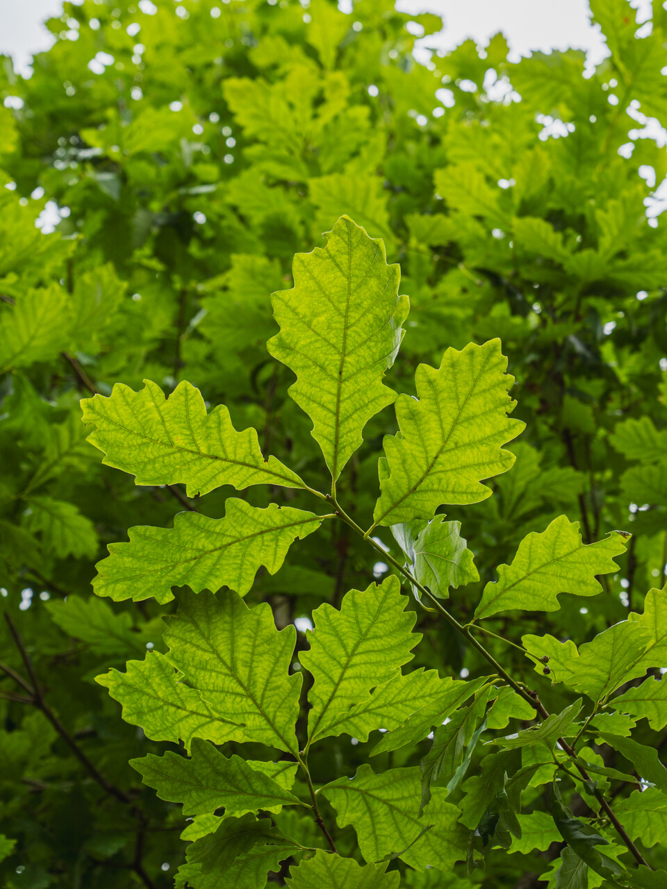 Hybride tussen Q. macrocarpa en Q. robur die als spontane zaailing werd gevonden. Het is een relatief snel groeiende grote boom met breed piramidale kroon. Uiteindelijk kan de boom meer dan 20 m hoog worden bij een breedte van circa 15 m. Op de oudere twijgen en bast wordt niet of nauwelijks kurk gevormd en de bast is gegroefd met rechthoekige platen. Het omgekeerd eironde tot langwerpig-omgekeerd eironde blad is regelmatig ondiep gelobd met driehoekige lobben die afgeronde toppen hebben. Het blad is glanzend donkergroen en 6 tot 15 cm lang. De eivormige vruchten zijn 1,8 tot 3 cm groot. Ze worden voor de helft omsloten door het napje dat met korte, iets zilverkleurige, aanliggende schubben bezet is. Een bijzonder winterharde en windresistente, imposante parkboom.